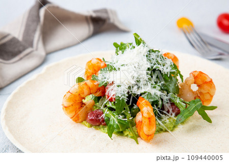 Chef put grilled shrimps on portion of freshly prepared healthy vegetable salad