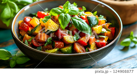 Baked eggplants with tomatoes and feta cheese, with olive oil, basil and garlic. Breakfast concept.