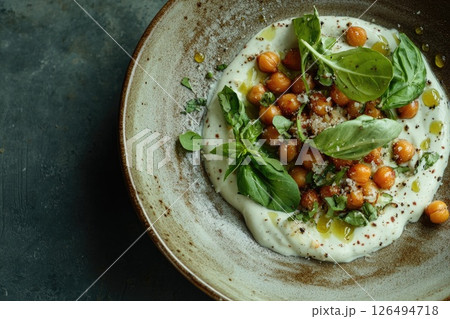 Creamy yogurt bowl topped with roasted chickpeas, fresh herbs, and olive oil drizzle