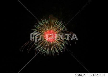 緑色とピンク色が鮮やかな割物の打ち上げ花火