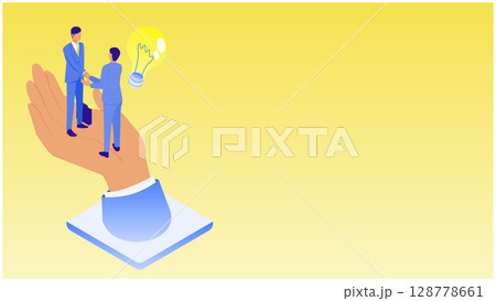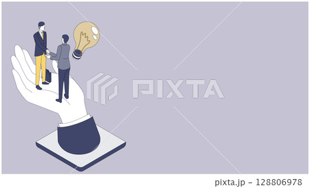 信頼の手のひらで握手!アイデアが生まれる瞬間のアイソメイラスト