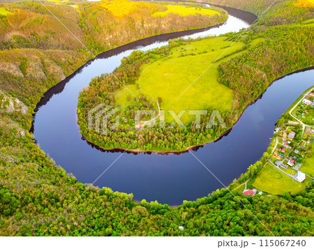 An aerial view captures the vibrant Horseshoe Bend on the Vltava River in Solenice, Czechia. The river curves dramatically through lush green landscapes under a clear sky.