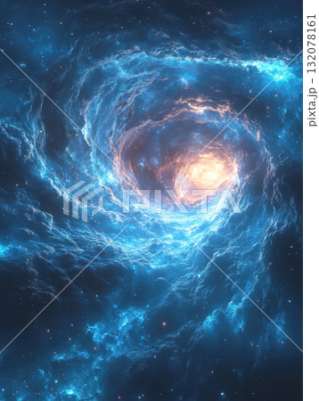A stunning, vertical abstract of a cosmic blue nebula swirling into a vortex or wormhole, centered on a blazing orange-yellow light source, conveying themes of deep space, astronomy, and infinity
