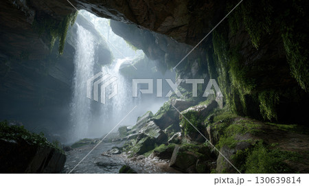 Giant waterfall cavern with roaring water, mist, mossy rocks, and lush green vegetation