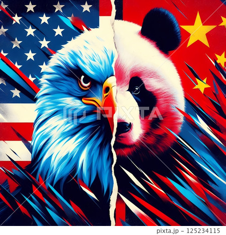 Bald Eagle vs Panda on Torn National Flags Representing Geopolitical Rivalry for Symbolic US China Conflict with Generative AI.