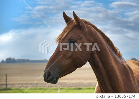 A close-up profile of a beautiful brown horse, showing its head with sky in the background