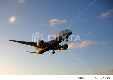 朝日を浴びて着陸する航空機
