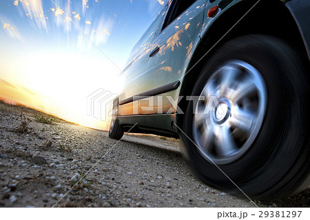 Low angle side view of car driving fast at sunset with motion speed effect .