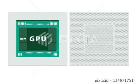 HBMを搭載したGPU基盤構造のフラットイラスト 裏表で理解する高速演算とメモリ構成