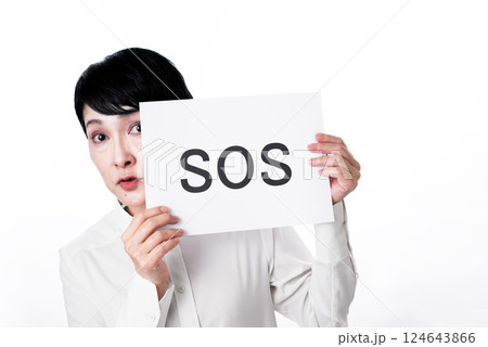 SOSと書かれたカードを掲げる中年女性