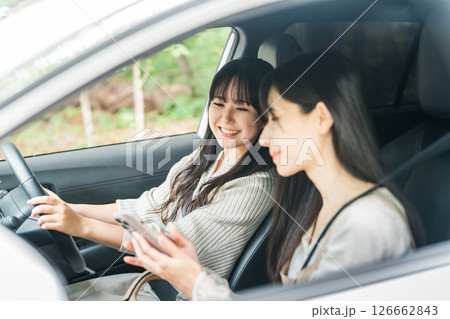車を運転する女性と助手席に乗る女友達(ドライバー,ドライブ)