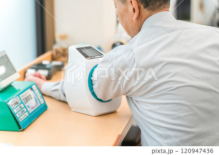 病院・クリニックで人間ドック・健康診断する男性(血圧)
