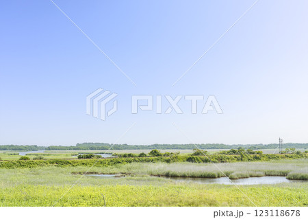 春の北海道苫小牧市ウトナイ湖湖畔に広がる湿地帯の風景を撮影