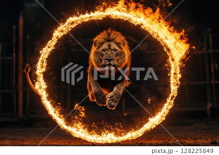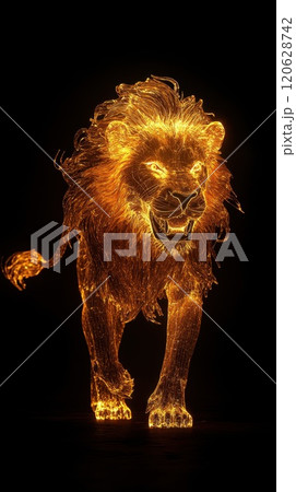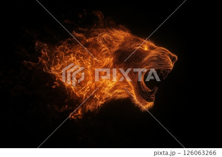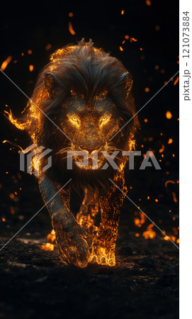 燃え盛る炎のようなオーラをまとった眼光の鋭いライオン。野生の力、勇気や自信と挑戦のイメージ。