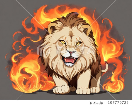 Furious lion in the fire of destruction. Angry furry lion with a growl giving a death stare. Cat like beast causes chaos and destruction on a fire background. Fictional scary character with a grin.