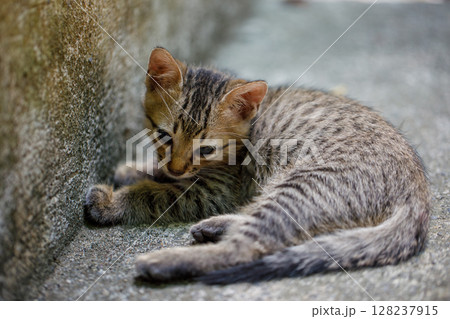 Lonely tabby kitten lying on the cold ground near a wall outdoors