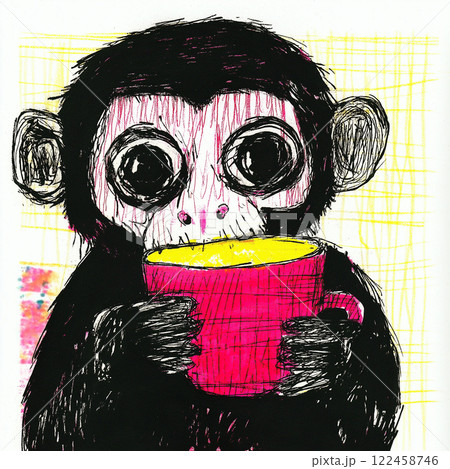 A simple drawing of a monkey holding a big cup of tea. A close-up doodle portrait of a chimpanzee drinking coffee. AI-generated illustration
