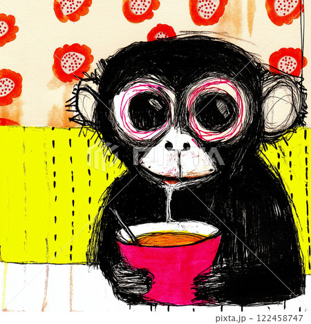 A simple colorful drawing of a monkey holding a big cup of tea. A close-up doodle portrait of a chimpanzee eating soup from a big bowl. AI-generated illustration