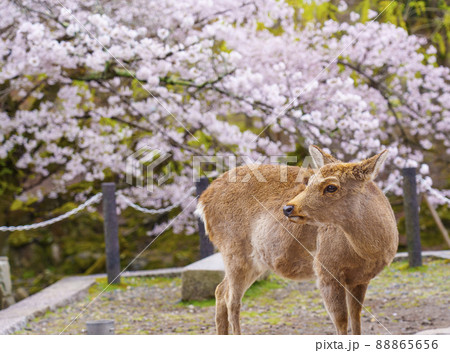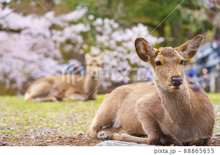 奈良公園の芝生に休憩している鹿 桜が満開の季節
