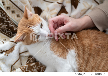 猫を撫でる 茶トラ白