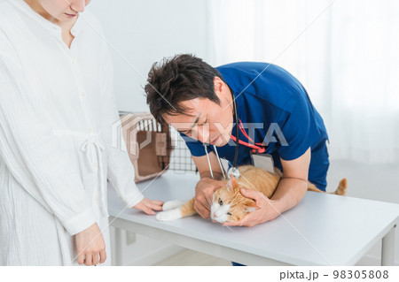 動物病院で獣医師に診察を受ける猫と飼い主のアジア人女性(ペット・聴診器)