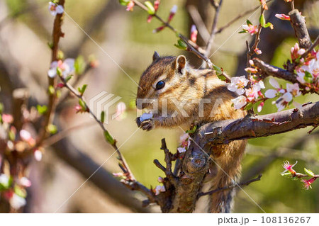 桜の花を食べるシマリス 春の可愛い動物シーン