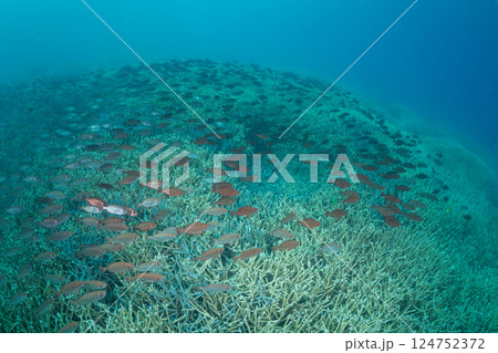 サンゴに住むナンヨウハギ、フタスジリュウキュウスズメダイ他幼魚の群れ。ヒリゾ浜南伊豆町中木静岡県伊豆