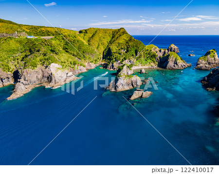 青い海と緑の岬が美しいヒリゾ浜のドローン撮影。 ヒリゾ浜渡船がちょうど船着き場に接岸するところ。