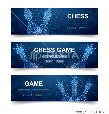 Polygonal glowing chess interface banner with luminous pieces, representing futuristic digital gaming and smart strategic thinking