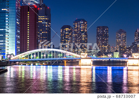 都市夜景 東京 ライトアップされた勝鬨橋と隅田川