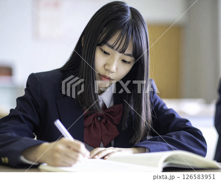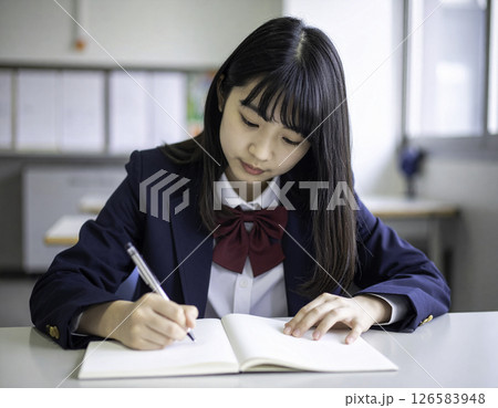 明るい教室で学ぶ日本人女子学生・笑顔で勉強に励む姿