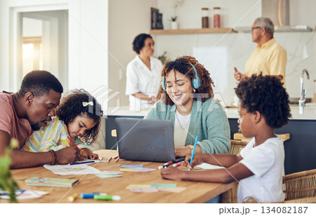 Family, education and work from home support, children writing and drawing with parents working on laptop. Biracial people, mother and father helping with remote job, teaching kids and language talk