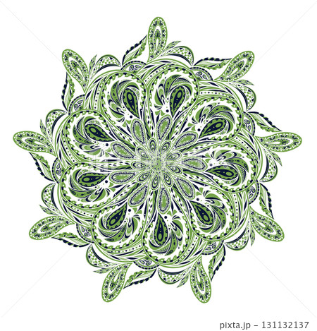 流れるような緑の渦巻き模様の華やかなペイズリーモチーフデザイン