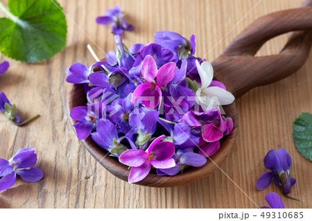 Wood violet flowers on a spoon on a table