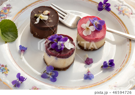 Raw vegan desserts with fresh violet flowers