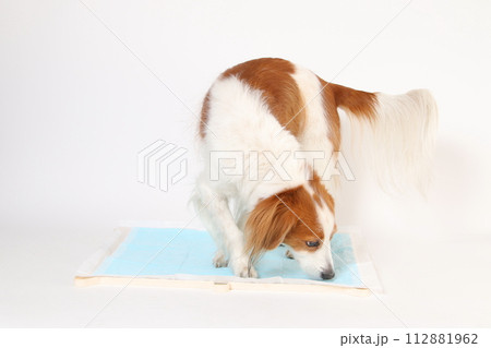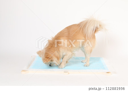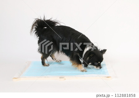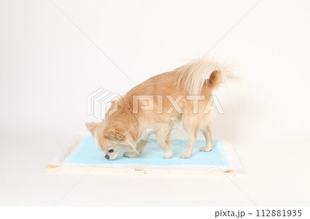 野外でトイレシートの上におしっこをするロングコートチワワ