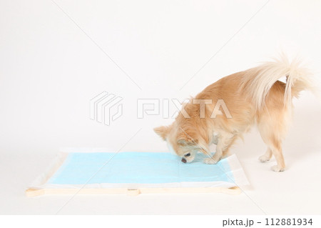 トイレ前、トイレシーツの匂いを嗅ぐチワワの様子