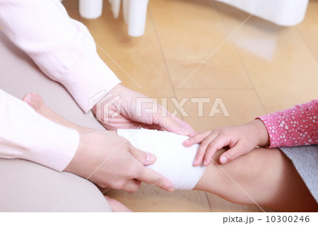 子供の足に包帯を巻く母親