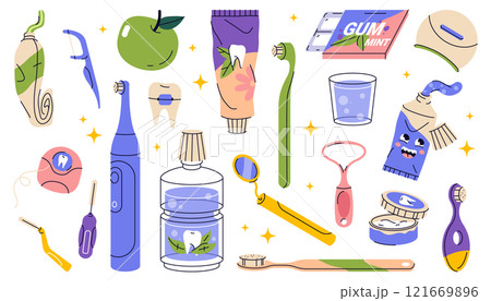 Set of dental tools or oral care items. Vector icon of mouth cleaning and teeth whitening, tooth brushing accessory. Orthodontic equipment. Toothbrush and gum, rinse and tongue scraper, toothpaste.