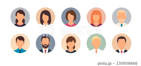 企業で働く様々な年代の男性や女性のアイコンセット。丸背景