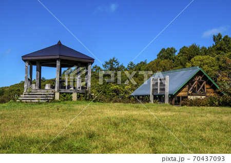 信州 長野県下高井郡木島平村 秋のカヤの平高原キャンプ場と牧場