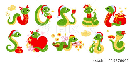 New Year snakes. Funny serpents. Horoscope characters. Chinese zodiac animals. 2025 symbols. Reptile mascots bringing good luck or well being. Python with money bag. Garish vector set