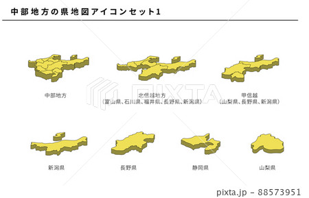 日本地図、中部地方の県地図アイコンセット1、ベクター素材