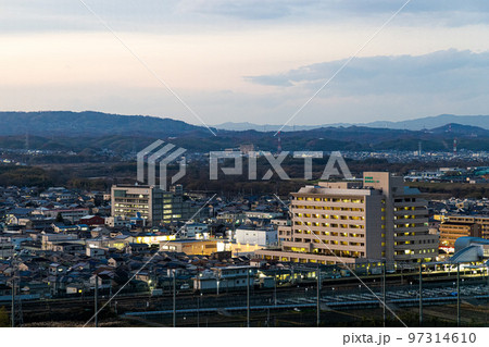 京都府最南端木津川市城山台城跡からの夕景 暮れなずむJR木津駅 広角