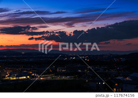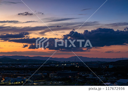 京都府最南端木津川市城山台からの夕景 山際の夕焼けと紺色の空 木津の街を見下ろす高台にて#27