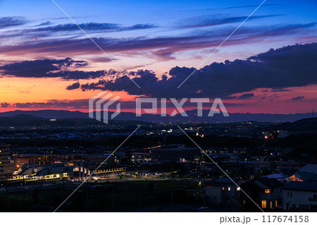 京都府最南端木津川市城山台からの夕景 山際の夕焼けと灯りが灯る街 木津の街を見下ろす高台にて#7
