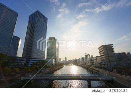 逆光の西日に照らされる大阪ビジネスパーク(OBP)のビル群 冬の午後