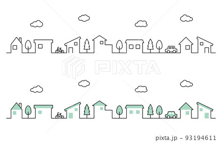 住宅の街並みのラインイラストセット(横型、緑色、雲)