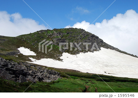 北海道の山 大雪山 黒岳石室からお鉢平への登山道 雪渓 北海岳と間宮岳と白雲岳を望む