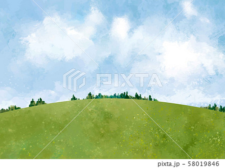 草原:丘 大地 緑 景色 青空 空 自然 背景 水彩 手描き 青空 空